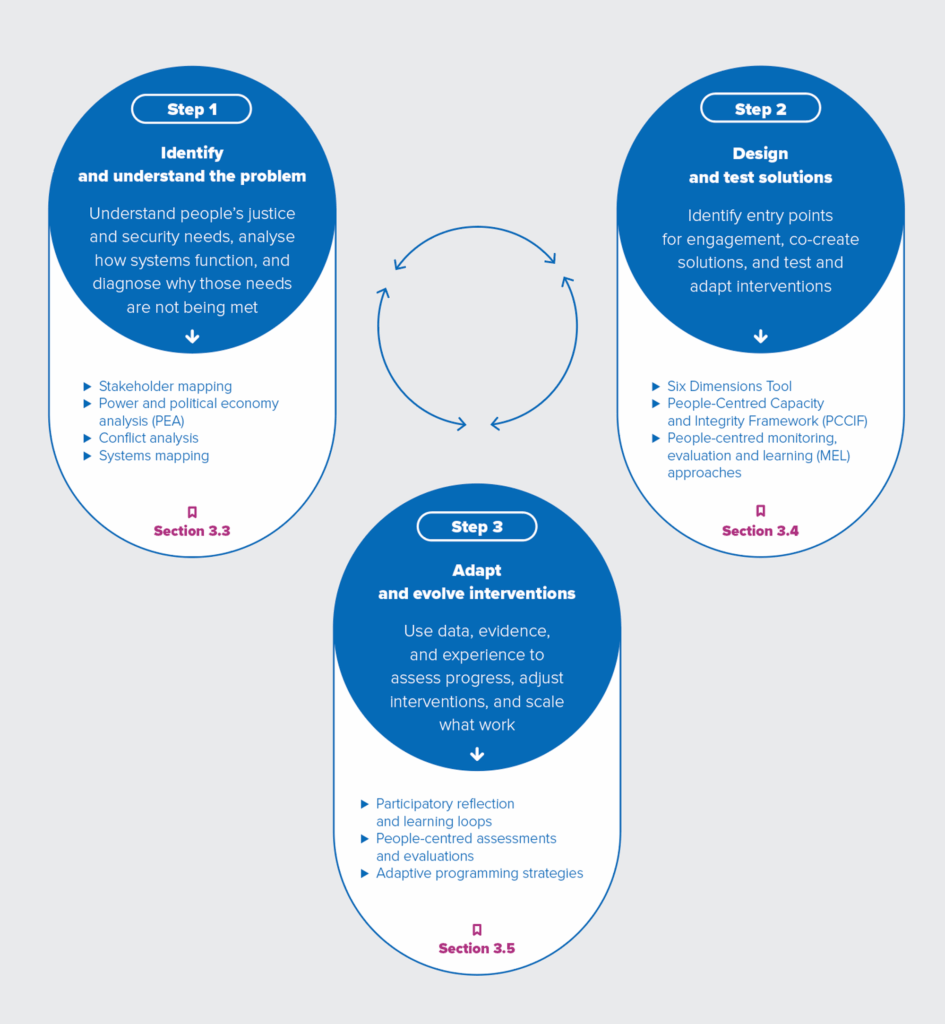 | Step 1 | Identify and understand the problemUnderstand how people experience justice and security and how systems contribute to those outcomes. |