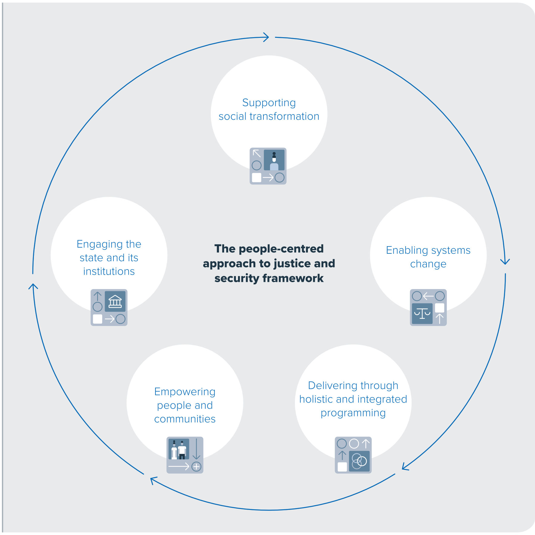 This requires a shift from conventional State-centric approaches to a people-centred one. It does not mean focusing solely on communities or moving away from support for State institutions. Rather, it emphasizes the importance of strategically combining community-driven and institution-focused interventions in a mutually reinforcing way. Community action empowers people, especially the vulnerable and marginalized, to articulate their needs, claim rights, shape solutions and hold justice and security providers to account. Institutional reform, in turn, is essential to address systemic barriers, embed rights protections, and ensure high-quality, fair and accountable service delivery. When pursued together, these two levels create cycles of change that strengthen trust, responsiveness and legitimacy across the justice and security system as a whole.